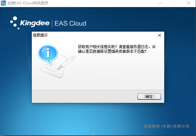 EAS登录时弹出框获取用户相关信息失败xxxx数据库设置错误或者版本不匹配?